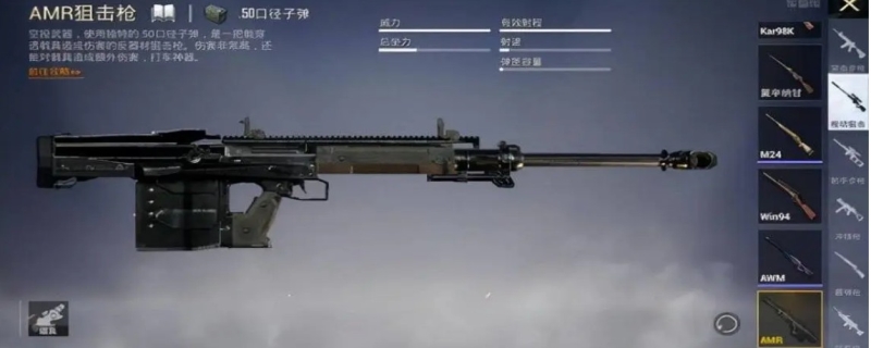 AMR狙击枪介绍:武器使用独特.50弹药,弹匣内装5发,备弹5发。反器材武器,对载具备损害加成,有着穿透载具和载具残骸的能力,可对载具内或载具后躲藏的目标导致穿透损害。AMR狙击枪实战测评:发布两天被