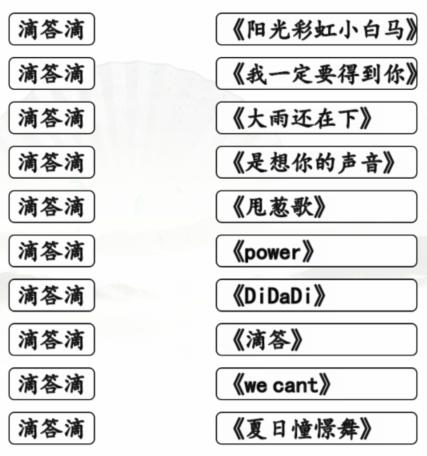抖音《汉字找茬王》滴答滴连出全部歌曲通关攻略滴答滴连出全部歌曲1、这一关都是滴答滴开头的歌曲,不列出来真的不知道原来有这么多滴