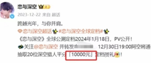 想必各位最近也听说了乙女圈的商战打的有多火热,原定于1月26日开启的公测提档到了1月18日,起因则是《恋与深空》官宣1月18日正式上线。《恋与深空》抽奖送一万元,他就要送一万