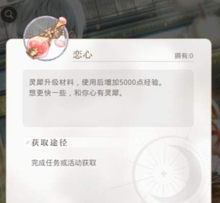 恋心是游戏中的大经验瓶子,除了恋心之外还有初心以及慕心,都是用于提升灵犀卡等级的。恋心目前主要是通过完成任务、限时活动、礼包、福利等途径获取的。游戏内没有固定的获取渠道。而慕心和初心可以通过主线关卡获