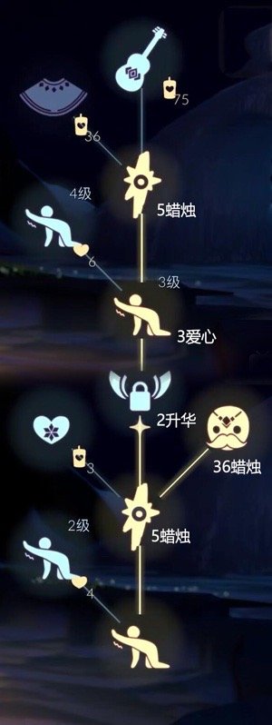 光遇吉他先祖兑换树什么样?吉他先祖也是带来黑金斗篷的先祖,下面为大家介绍一下这个先祖的兑换列表以及分支情况。如下图所示,由于国服是第二次复刻这位先祖,黑金斗篷价格涨到了65蜡烛。黑金斗篷、吉他都是需要