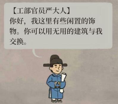 严大人的换取条件是入价要大于或等于出价,他对物品的喜好程度是不同的,他喜欢的物品就可以换取高一点的价格,反之价格就会很低。严大人喜欢的物品有竹林花园,百年银杏,荷花池,玲珑棋局和喜笑颜开旗,这些都可以