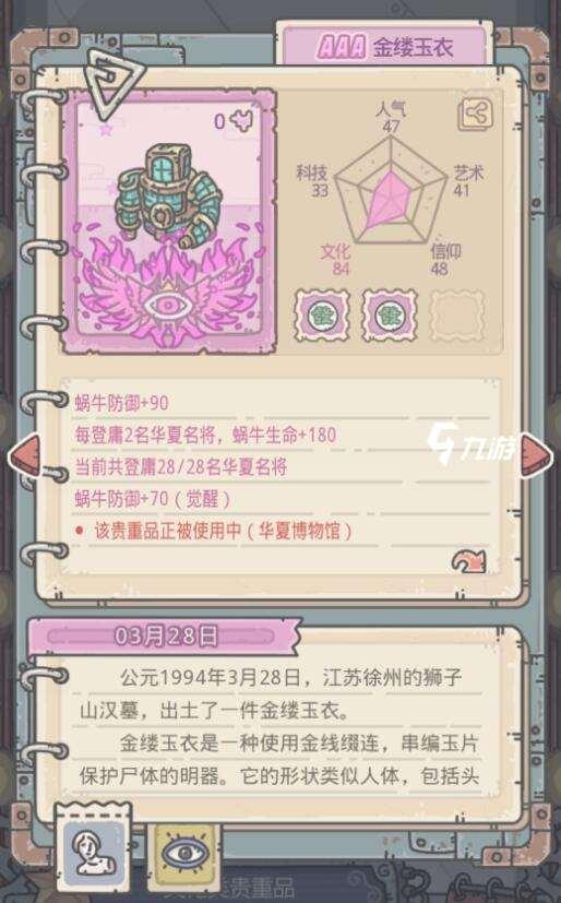 探索华夏地区的时候遭遇女娲陵墓事件,需要放置的贵重物品就是下图这个AAA评级的【金缕玉衣】,这个是文化属性的贵重物品,属性加成上侧重于防御。符合“与华夏文明相关”以及“紫色品质”这两个条件,