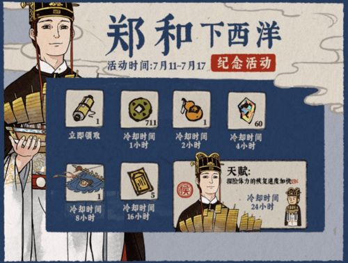 江南百景图郑和下西洋活动结束时间就是在7月17日晚上的快12点的时候,所以在这个时候玩家也是可以尽量领取一下,毕竟要是玩家没有领取的话,那么玩家就没法领取全部的奖励了,而最后的奖励就是郑和这个候级居民