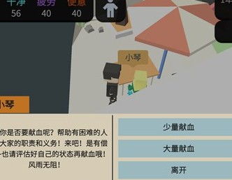游戏中有“献血”玩法的设定,献血会降低角色的体力值,提升疲劳值,而且献血过多的话会住院,因此玩家不可以利用这个系统来刷钱。献血的位置在商业街里,玩家在14:00~15:00期间来到商业街可以预见npc
