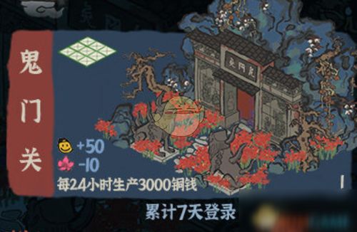 鬼门关这个建筑,是中元节签到活动中的最终奖励。模型效果如下图所示,值得一提的是,这个建筑并非是单纯的装饰性建筑,它和小摊贩一样是有产出能力的,并且每24小时可以产出3000铜币,这个产出能力相当于部分